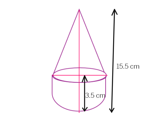 3. A toy is in the form of a cone of radius 3.5 cm mounted on a hemisphere of same radius.The total height of the toy is 15.5 cm. Find the total surface area of the toy.