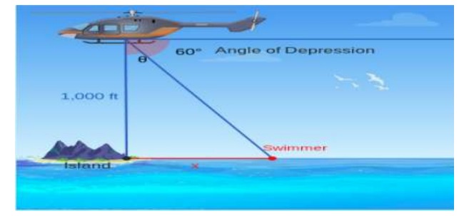A helicopter lifts up 1000 feet over an island and spots a swimmer that need to be rescued. Using a distant land mark, the helicopter pilot determines the angle of depression.