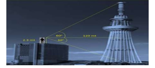 We know that during vacation period many people love to go out of the city and gain some experience about historical and scientific values. Keeping in views, Mr.Ramlal decided to go somewhere out of the country and chosen the country USA. In the series of sightseeing, he has first chosen the place sky tower of Mexico City. Then he decided to stand on a building and wanted to see the sky tower. Mr.Ramlal whose height is 2.3 m stood on the top of a building and started to look at the top of sky tower. The horizontal distance between sky tower and the building is 120mt. as shown in the given figure. The angle of elevation of the top and angle of depression of the bottom of the sky tower is 60° and 30° respectively. Looking into the above circumstances try to give the answer of the following questions: