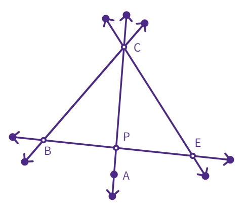 In the given figure, AC and BE intersect at P. AC and BC intersect at C, AC and EC intersect at C.