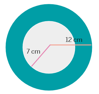 1. In the figure given below, a circle is inscribed inside another circle. The radius of the outer circle is 12 cm and that of the inner circle is 7 cm. Find the area of the shaded portion between the circles.