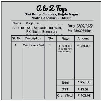 Note: GST in the above bill stands for ‘Goods and Service Tax’. This tax is applied on different products and services. We often notice that one person purchases from one seller and again sells to another customer. E.g., one may purchase plastic beads from one seller and thread from another and ultimately sell a bead necklace to a customer who may further sell it in a jewellery box to another. In such situations, the tax on the plastic beads should be paid only once and not by each seller. The GST system ensures this by making the final seller of the goods and service pay the tax collected from the final buyer.