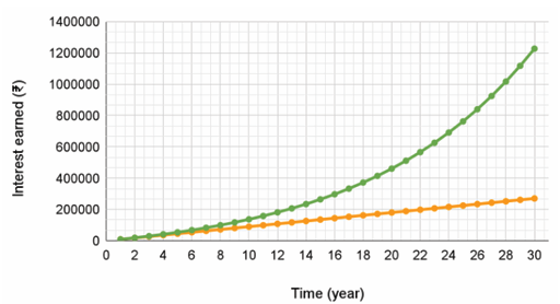 We can visualise the difference between “simple interest” and “compound interest” over a period of time through a simple activity of drawing the graphs corresponding to these two quantities. With this activity we can also see the rate at which the interest earned through compounding grows as the number of years increases.