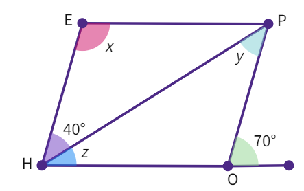 7. The adjacent figure HOPE is a parallelogram. Find the angle measures x, y and z. State the properties you use to find them.
