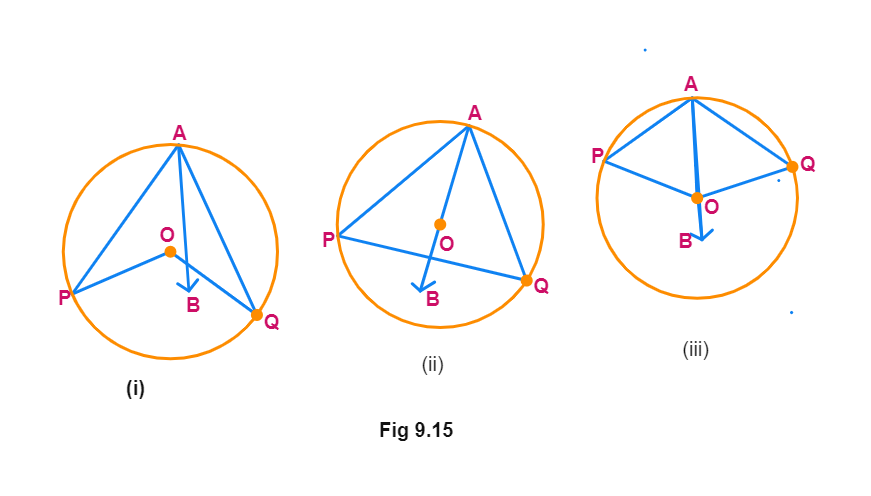Consider the three different cases as given in above figure. In (i), arc PQ is minor; in (ii), arc PQ is a semicircle and in (iii), arc PQ is major. Let us begin by joining AO and extending it to a point B.