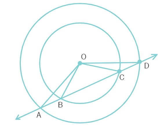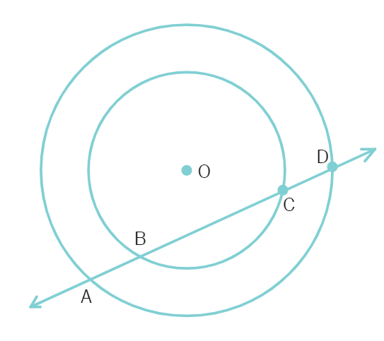 4. If a line intersects two concentric circles (circles with the same centre) with centre O at A, B, C and D, prove that AB = CD.