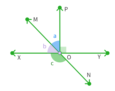 Lines XY and MN intersect at O. If ∠ POY = 90° and a : b = 2 : 3, find c.