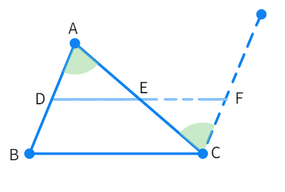 We have D and E as the mid-points of the sides AB and AC. Join both the points and extend DE further. Also draw a line parallel to the side AB from point C. Let the point at which the extended DE line and the line parallel to AB intersect be point F.