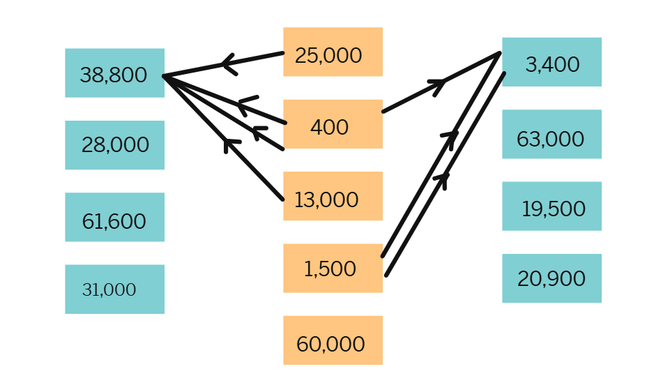 Numbers in the middle column are added in different ways to get the numbers on the sides (1500 + 1500 + 400 = 3400).