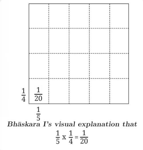 Bhāskara I, in his 629 CE commentary Āryabhaṭīyabhāṣhya on Aryabhata’s 499 CE work, described the geometric interpretation of multiplication of fractions (that we saw earlier) in terms of the division of a square into rectangles via equal divisions along the length and breadth.