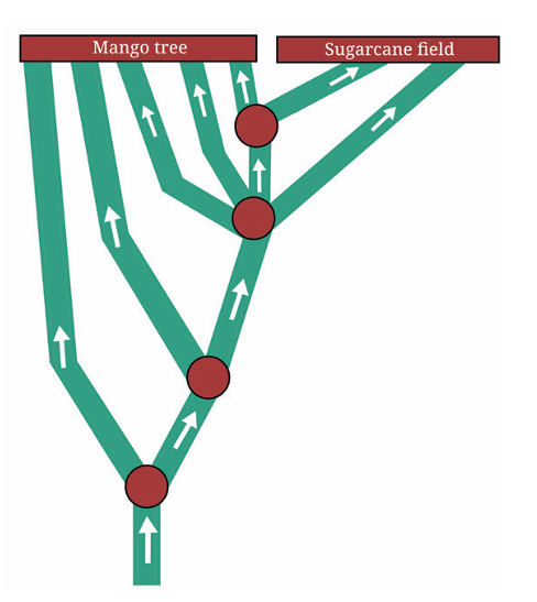 11. A colony of ants set out in search of food. As they search, they keep splitting equally at each point (as shown) and reach two food sources, one near a mango tree and another near a sugarcane field. What fraction of the original group reached each food source?