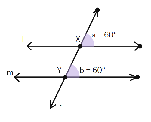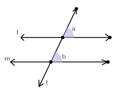 Angles, ∠a and ∠b are corresponding angles formed by the transversal t on lines l and m. These corresponding angles are equal to each other.