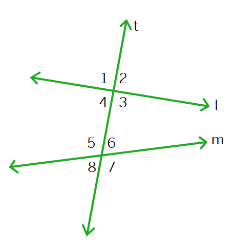 In the figure, we notice that the transversal t forms two sets of angles: one with line l and another with line m. There are angles in the first set that correspond to angles in the second set based on their position. ∠1 and ∠5 are called corresponding angles. Similarly, ∠2 and ∠