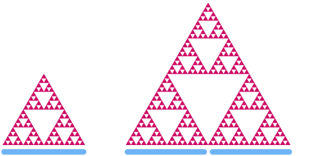 Notice how the final shape is made up of three identical copies of itself, and each of these is made up of even smaller copies of the entire triangle! You could keep zooming into the triangle forever, and the patterns and shapes will always continue repeating.