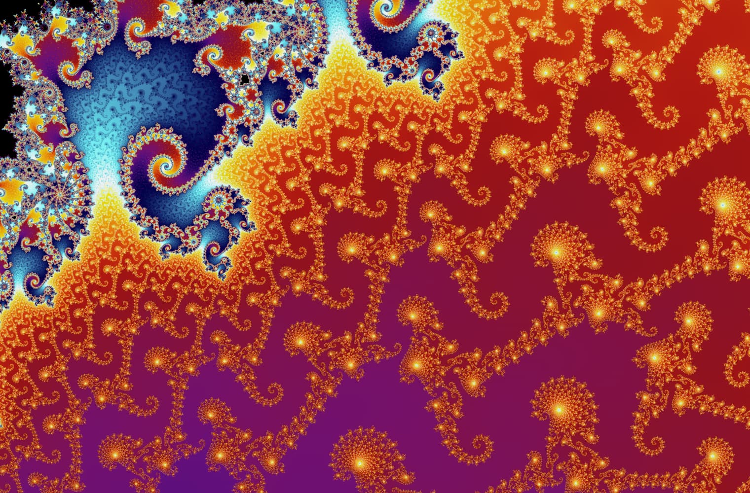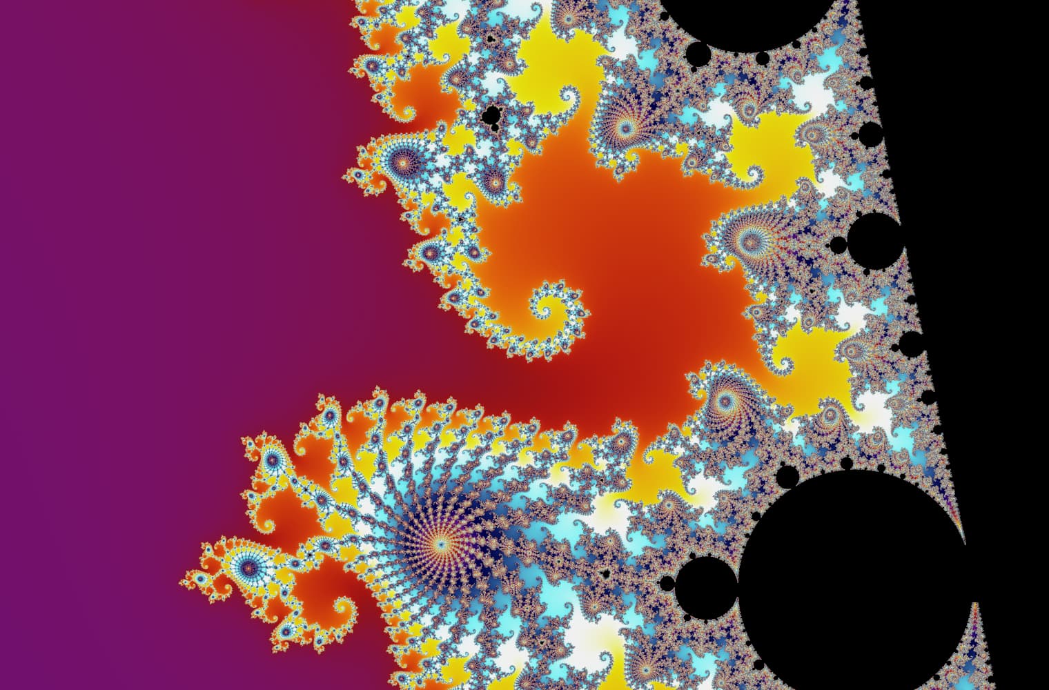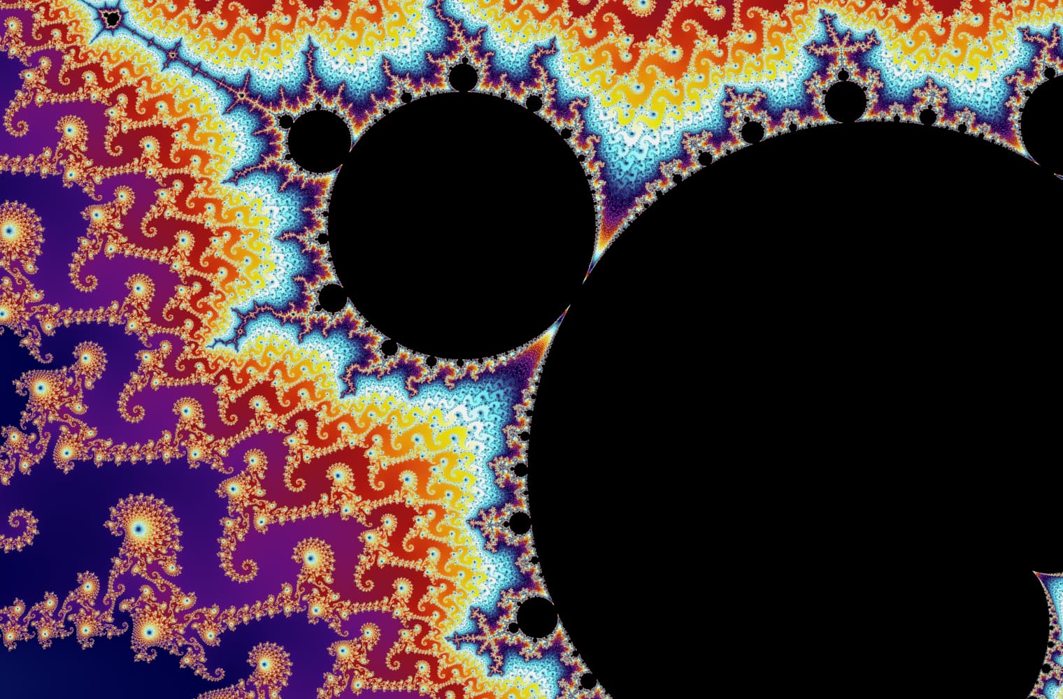 Like all fractals, we can “zoom into” the Mandelbrot set forever, finding new patterns at every scale. Here you can zoom into a part of the Mandelbrot set that is called the Seahorse valley. Black points are inside the Mandelbrot set, where the sequence is bounded. Coloured points are outside the Mandelbrot set, where the sequence diverges, and the different colours indicate how quickly it grows to infinity: