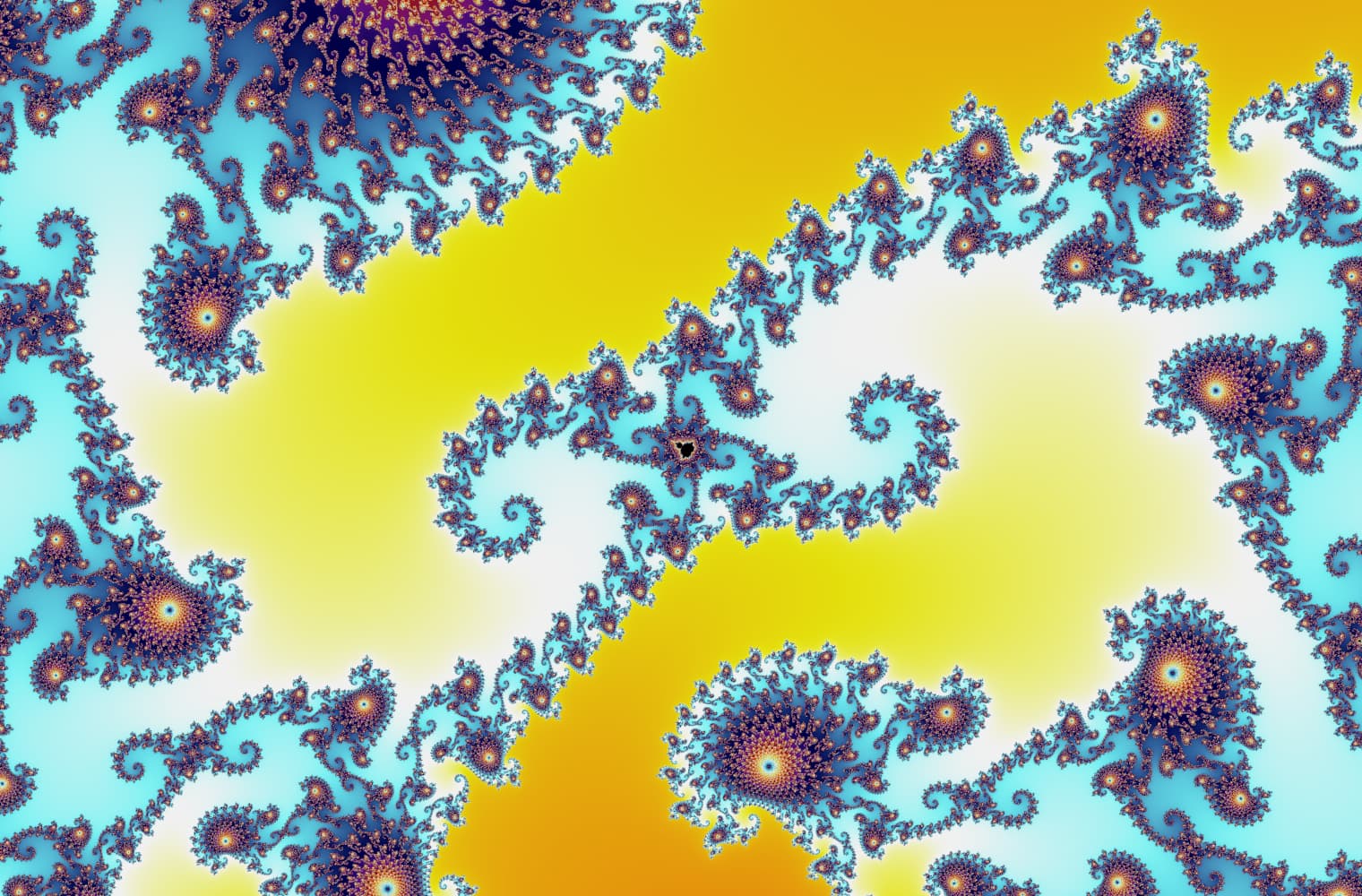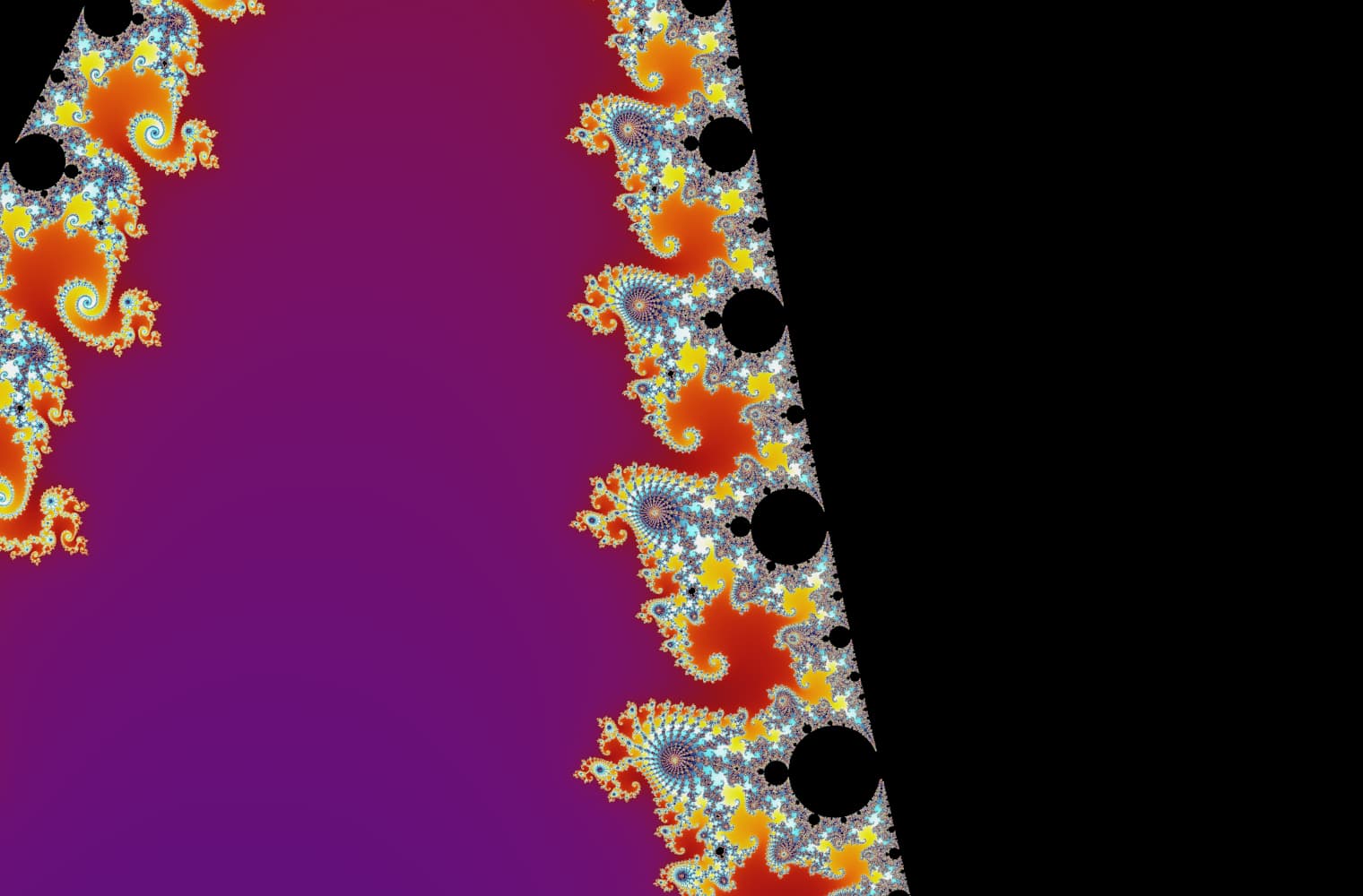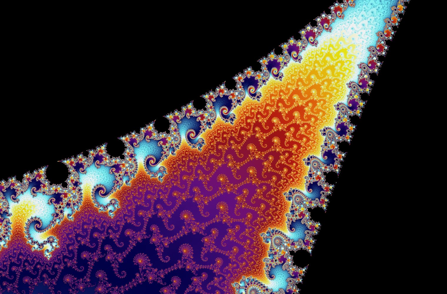 Like all fractals, we can “zoom into” the Mandelbrot set forever, finding new patterns at every scale. Here you can zoom into a part of the Mandelbrot set that is called the Seahorse valley. Black points are inside the Mandelbrot set, where the sequence is bounded. Coloured points are outside the Mandelbrot set, where the sequence diverges, and the different colours indicate how quickly it grows to infinity: