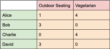 Each friend has preferences for how important these things are, which we can quantify with a value 0 (not important) to 4 (very important). If we create a table with friends on the left-most column and restaurant features across the top row, we can fill in the cells of the table with each friend's preference for that feature.