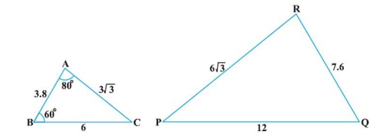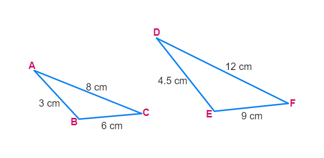 Draw two triangles ABC and DEF such that AB = 3 cm, BC = 6 cm, CA = 8 cm, DE = 4.5 cm, EF = 9 cm and FD = 12 cm (see Fig).