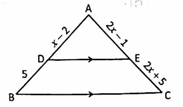(5) In ΔABC, DE || BC. If AD = x – 2, DB = 5, AE = 2x – 1, EC = 2x + 5, then find the value of x.