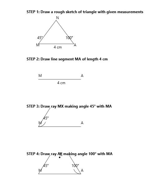3. Construct ΔMAN with MA = 4 cm, ∠M = 45° and ∠A = 100°