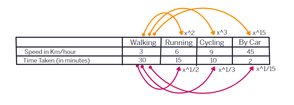 For example: As the number of workers increases, time taken to finish the job decreases. Similarly, if we increase the speed, the time taken to cover a given distance decreases. To understand this, let us look into the following situation.