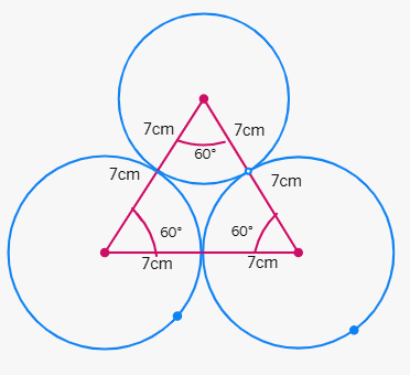 The radius of each circle is half the side length of the triangle.