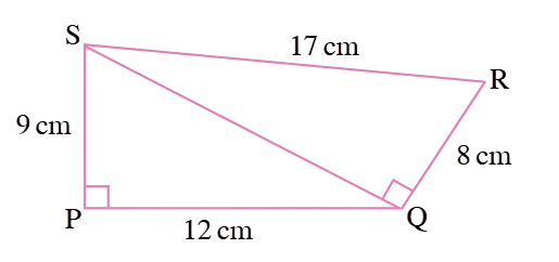 2. Find the area of a quadrilateral PQRS in which ∠QPS = ∠SQR = 90°, PQ = 12 cm, PS = 9 cm, QR = 8 cm and SR = 17 cm (Hint: PQRS has two parts).