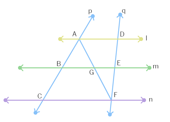 Example 7 : l, m and n are three parallel lines intersected by transversals p and q such that l, m and n cut off equal intercepts AB and BC on p. Show that l, m and n cut off equal intercepts DE and EF on q also.