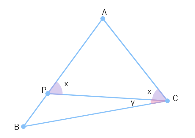 Now, take a point P on line AB such that AP = AC. Join the two points C and P to set CP. Let us assume angle APC is x° and angle BCP is y°.